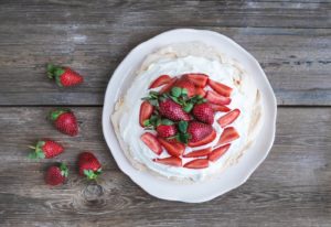 Rustic Pavlova cake with fresh strawberries and whipped cream ov